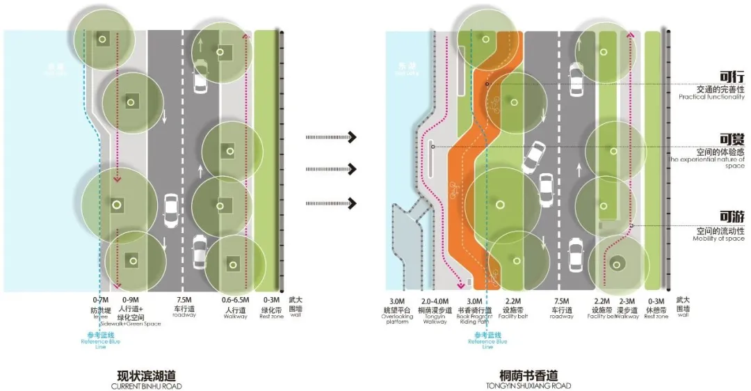 凌波门市政区域人行狭窄、公交站区域空间短促,不利等候;凌波门栈桥区域人气旺盛,但驳岸坡陡,不利于亲水体验,栈桥本身陈旧,具有一定的安全隐患。设计在尊重原有格局基础上,从游客体验角度出发、打造多主题活动、多样亲水体验、多元观景方式的凌波映日景点。